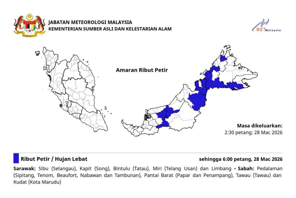 马来西亚气象部门于今日(2026年3月28日)下午2时30分发布雷暴天气警报,预计多地将出现雷暴、强降雨及强风天气。