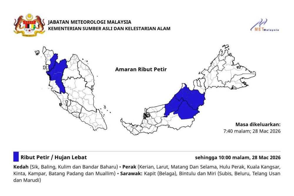 气象部门发布雷暴警报,预计雪兰莪、霹雳、吉打及砂拉越部分地区将出现雷暴、大雨及强风,民众需提高警觉。