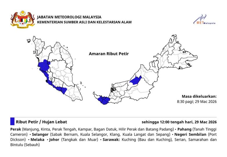 根据通报,此轮不稳定天气预计影响霹雳、彭亨、雪兰莪、森美兰、马六甲、柔佛以及砂拉越多地,包括古晋、三马拉汉、诗里阿曼及民都鲁部分区域,相关情况将持续至今日中午12时。