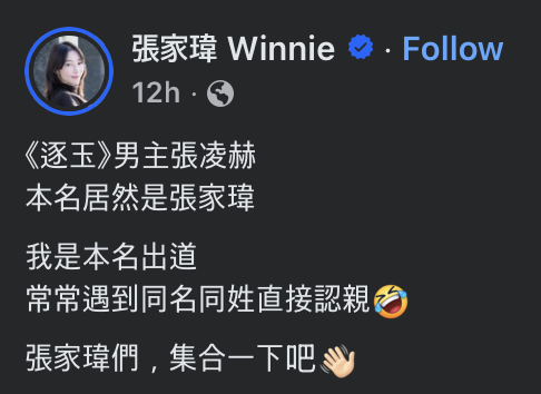 对此,台湾艺人张家玮也亲自回应,在社交平台幽默发文调侃,表示自己一直以本名出道,常遇到同名情况,更笑喊“张家玮们集合”,瞬间带动网友互动。