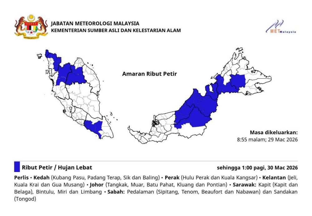 国家气象局29日晚间发布雷暴警告,预计从今晚至明早,全国多地将出现雷暴、强降雨及大风天气。受影响的地区包括:
