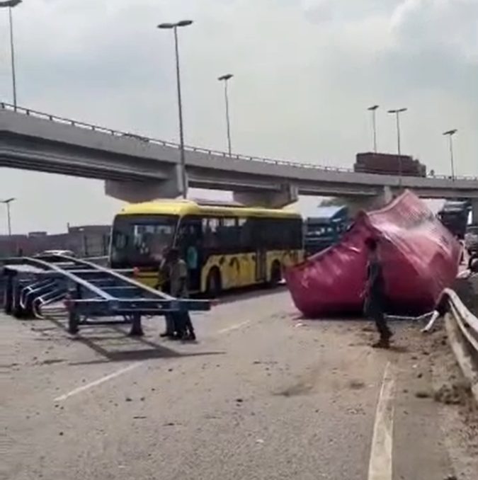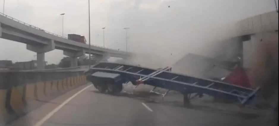 巴生南区警方表示,一辆拖格罗里疑因车速过快,导致车头与拖格及货柜分离,从高架桥坠落至路面,幸好未造成人员伤亡。