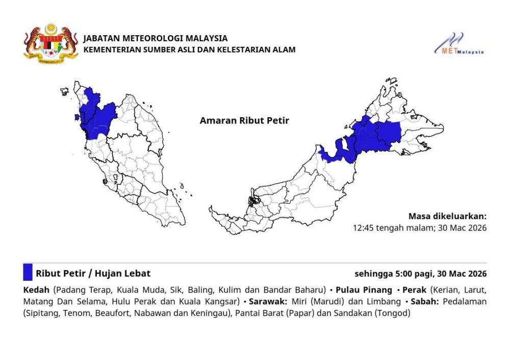 马来西亚气象局于2026年3月30日凌晨12时45分发布雷暴警告,预计吉打、槟城、霹雳、砂拉越及沙巴部分地区将出现雷暴、暴雨及强风天气。