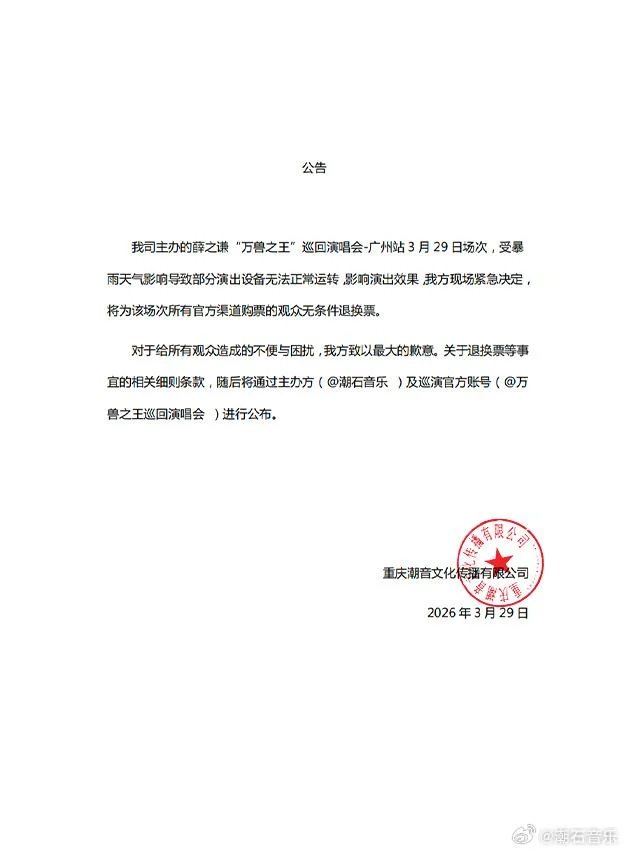 当晚受强对流天气影响,暴雨、雷电与强风交织,导致舞台灯光、音响及LED系统频频故障,整体呈现效果明显下降。演出进行过程中,薛之谦逐渐察觉状况异常,随后在台上向观众说明情况并致歉。