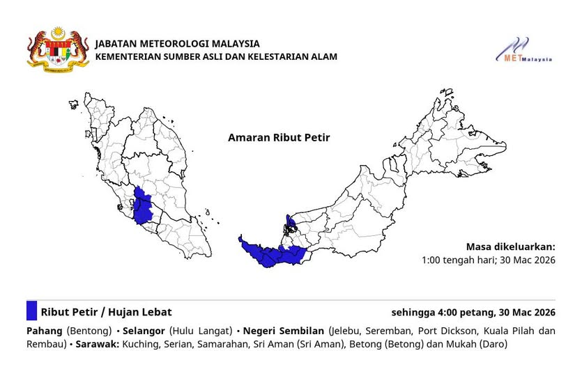 马来西亚气象局于今日(3月30日)下午1时发出雷雨预警,预计多个地区将迎来强降雨与雷暴天气。根据最新气象预报,这场不稳定的天气状况将持续影响半岛及砂拉越局部地区,直至今日下午4时。