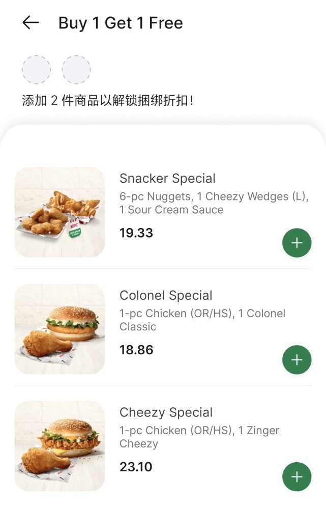 据了解,用户通过GrabFood点选指定KFC餐点,即可自动享有Buy 1 Free 1优惠。参与促销的餐点包括Snacker Special、Colonel Special及Cheezy Special等,不过实际供应项目可能因门店而有所不同。