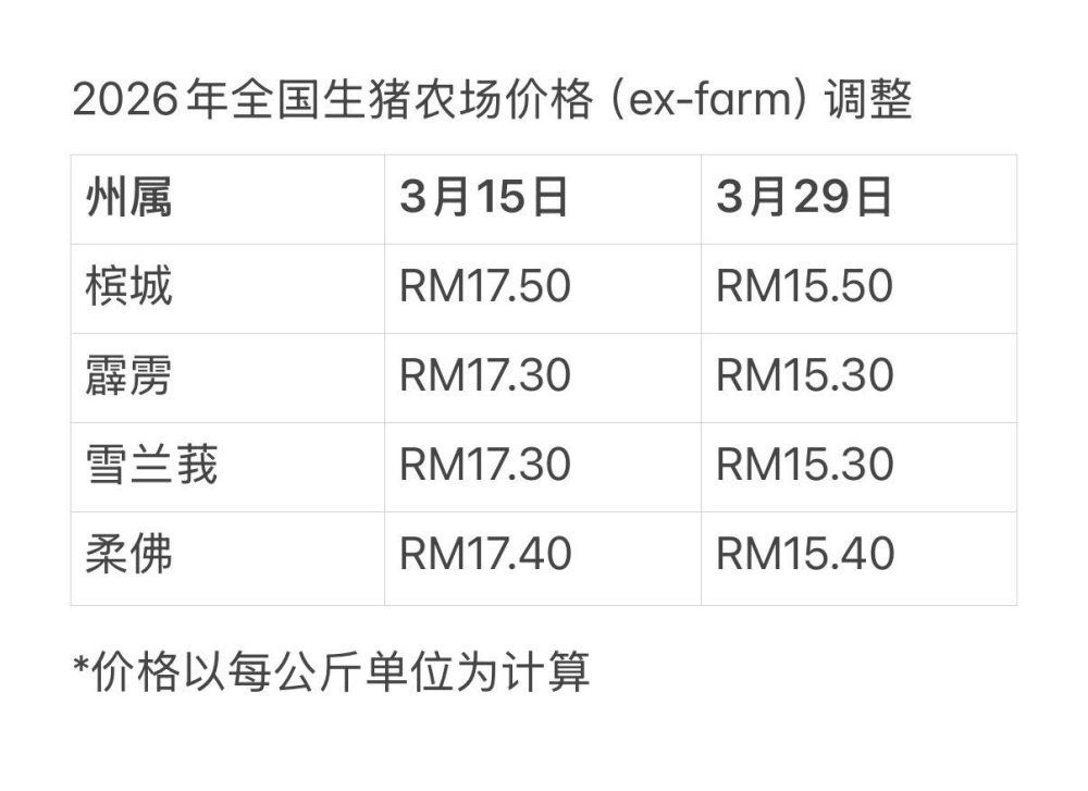 他今日通过脸书发文表示,生猪农场价这次是以每100公斤下调超过200令吉的幅度执行,换算下来,相等于每公斤下调2令吉。现阶段,这项价格已在半岛全面落实。