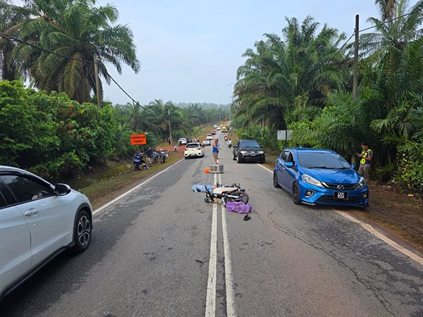 这起事故日前发生在彭亨州百乐县直凉通往明光的联邦10号公路。据了解,当时两辆摩托车皆从明光方向驶往直凉,途中疑似相撞。其中一名骑士在冲击下被甩至道路中央。