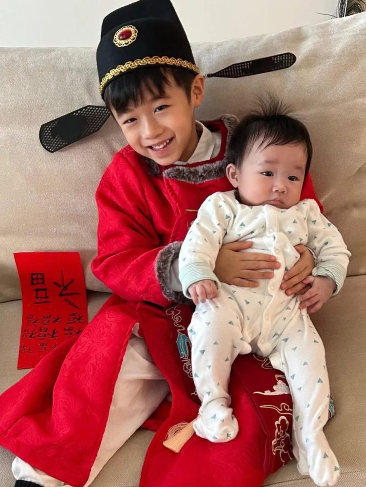 照片中,古巨基抱着小儿子,宝宝五官精致、脸蛋圆润,与哥哥十分相似,画面温馨。