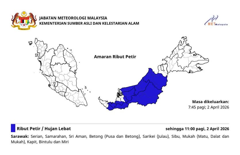 大马气象局今早发布紧急气象预警,砂拉越多个省份包括斯里阿曼、木中及诗巫等地,预计将迎来雷雨及强风侵袭,恶劣天气恐持续至今日上午11时。
