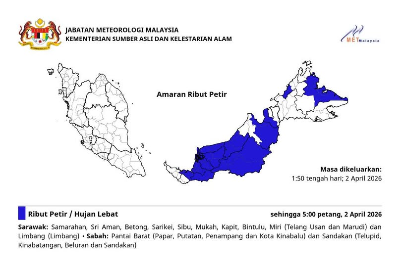 气象局发出紧急气象预警,东马多地在今日(4月2日)午后将迎来严峻的天气考验。