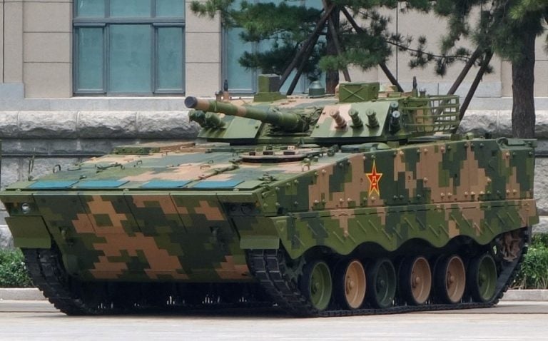 根据社交平台X账号“李老师不是你老师”及“新闻调查”整理的信息,这段被指为演习现场的影像显示,一辆解放军ZBD-04A步兵战车在持续前进过程中,其右前方土丘高台上站着多名身穿军服的高阶军官,正在观看部队演练。