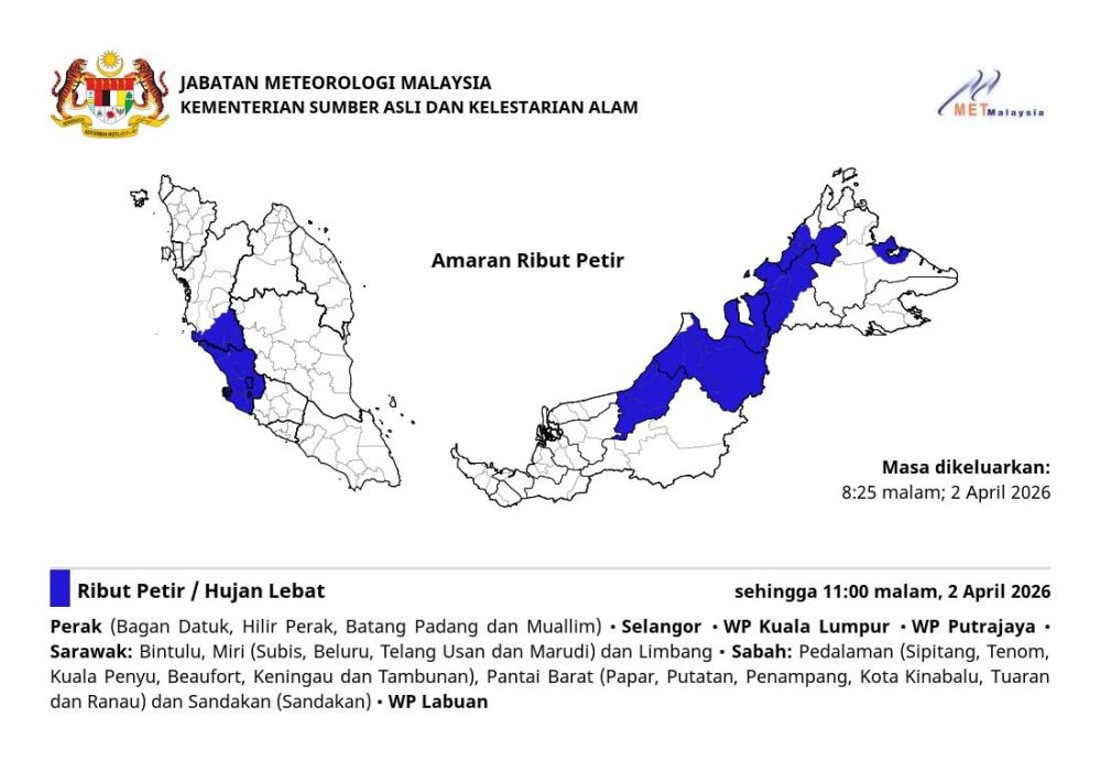 受影响地区涵盖霹雳州数个地区,包括安顺、下霹雳、峇登巴当及慕亚林,同时雪兰莪、吉隆坡与布城也处于警戒范围内。东马方面,砂拉越涉及民都鲁、美里多个县区及林梦,沙巴则包括内陆、西海岸及山打根一带,纳闽亦在预警名单中。