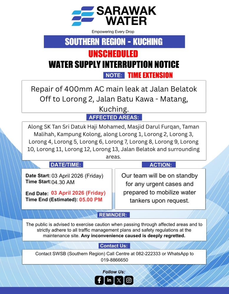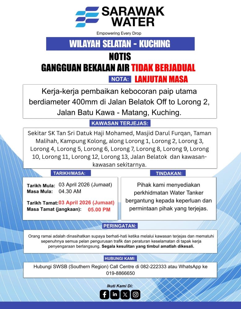 有关单位通知,由于位于 Jalan Belatok(通往 Lorong 2)一带进行400毫米水管维修工程,原定的突发制水将延长。