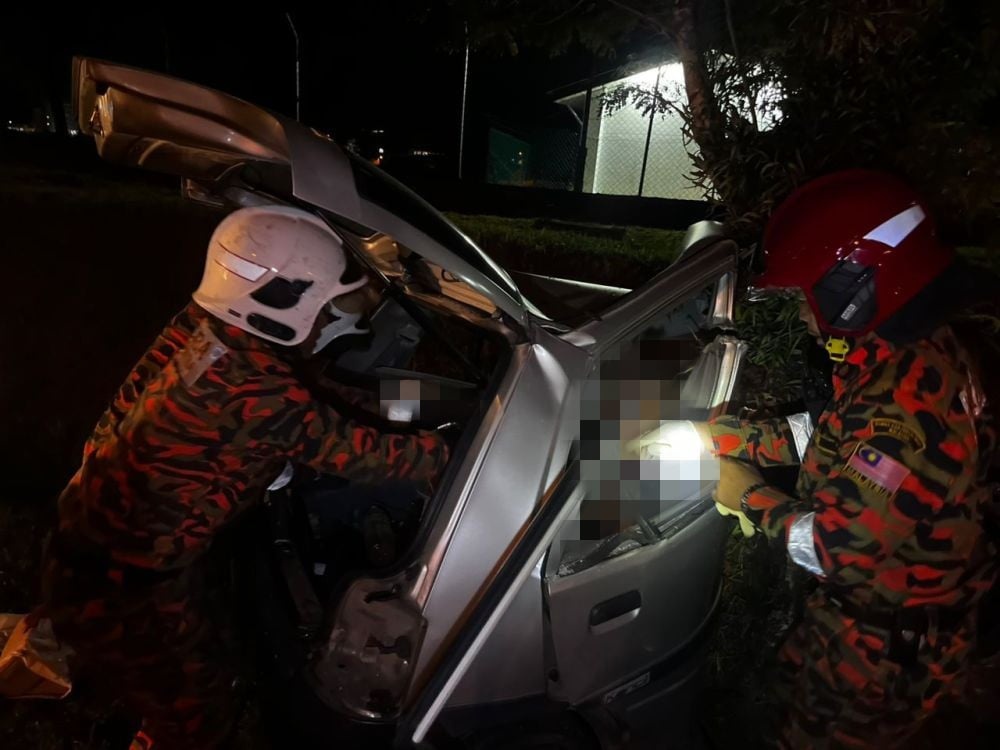 一名女司机在砂拉越古晋朋尼逊路驾驶轿车时,车辆打滑失控撞上路边大树,当场被困车内不幸身亡。
