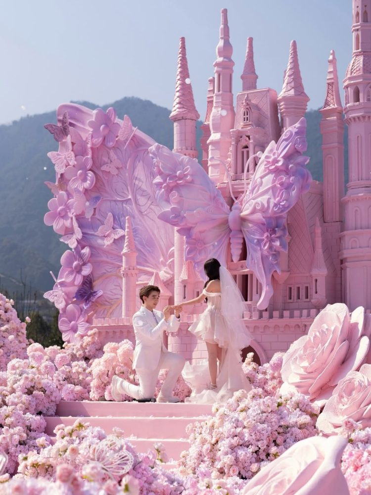 他在社交平台上传一段于中国杭州策划的求婚视频,现场布置极尽梦幻,以粉红色为主调打造蝴蝶城堡主题,从入口一路铺陈至主舞台,满满花海营造出如童话般的浪漫氛围。