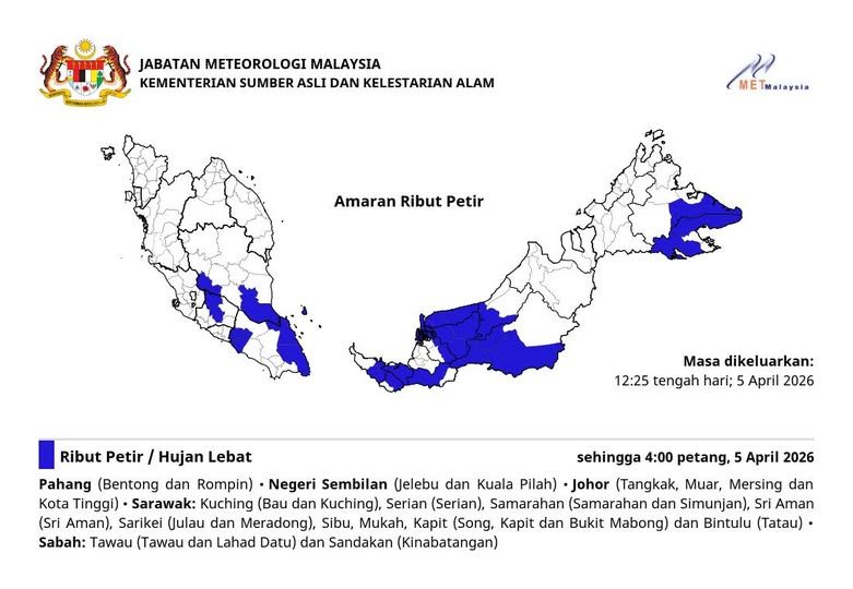气象局发布雷雨警报,预计彭亨(文冬、云冰)、森美兰(日叻务、瓜拉庇劳)、柔佛(丹绒、麻坡、丰盛港、哥打丁宜)、砂拉越(古晋、石隆门、西连、三马拉汉、实文然、斯里阿曼、泗里街、诗巫、沐胶、加帛、民都鲁)以及沙巴(斗湖、拿笃、京那巴当岸)一带,将出现雷暴、豪雨及强风天气,情况预计持续至2026年4月5日(星期日)下午4时。