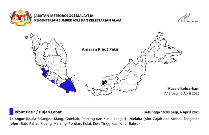 周一清晨,气象局对我国多个州属发布雷雨警报,预计大雨与强风天气将持续至今日上午10时。受影响地区涵盖雪兰莪、马六甲及柔佛三州,民众受促在通勤高峰时段提高警惕。