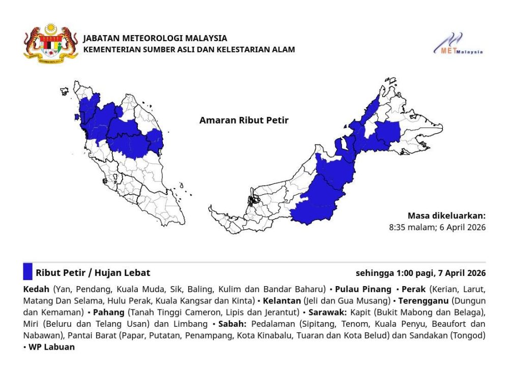 马来西亚气象局于今晚(4月6日)8时35分发布雷暴警告,预计包括雪州、槟城、霹雳、吉兰丹、登嘉楼、彭亨、砂拉越、沙巴及联邦直辖区纳闽在内的多个地区,将出现雷暴、大雨及强风天气,警告有效至明日凌晨1时(4月7日)。