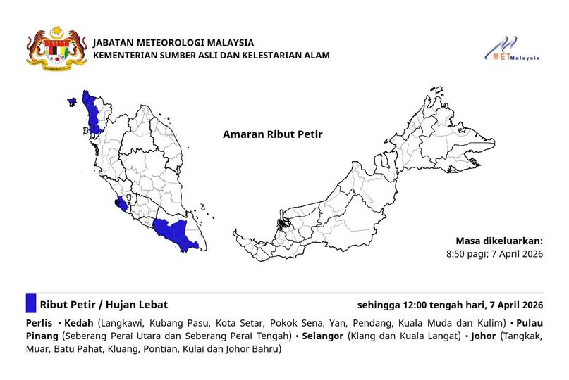 大马气象局针对北马及南马多个省市发布雷雨警报,预计受影响地区的恶劣天气将持续至今日中午12时。