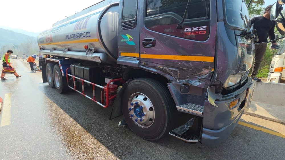 在距离侧翻拖格罗里约20公尺处,一辆柴油油槽罗里停在路中央,车身油槽从尾部至驾驶座后方一带出现明显擦撞痕迹,柴油也从驾驶座一侧的油槽位置泄漏出来。该名34岁油槽罗里司机表示,他原本从春武里开车前往湄索送货,途中遇上这起事故。
