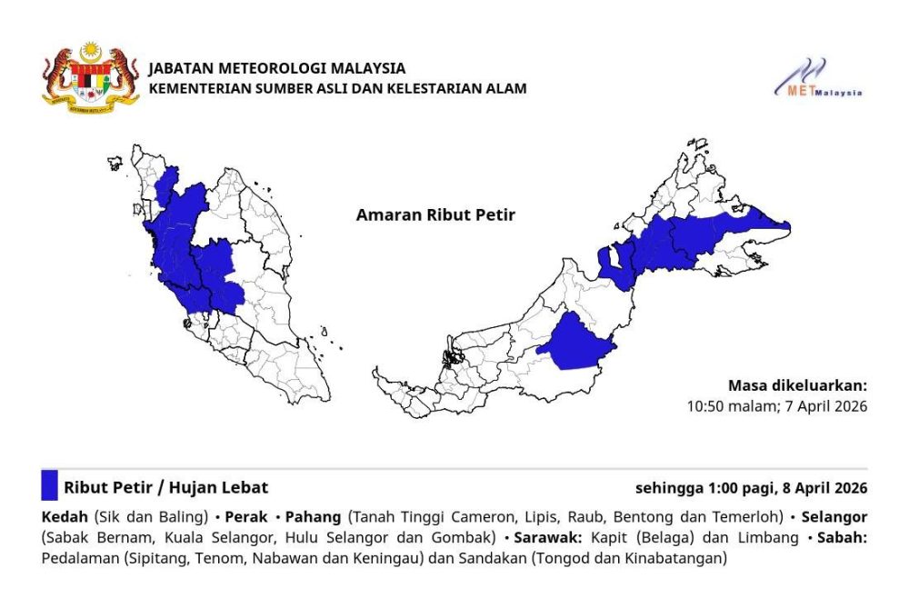 马来西亚气象局于今晚(4月7日)10时50分发布雷暴警报,预计将在以下地区出现强雷暴、暴雨和大风,警报有效至明日凌晨1时(4月8日):