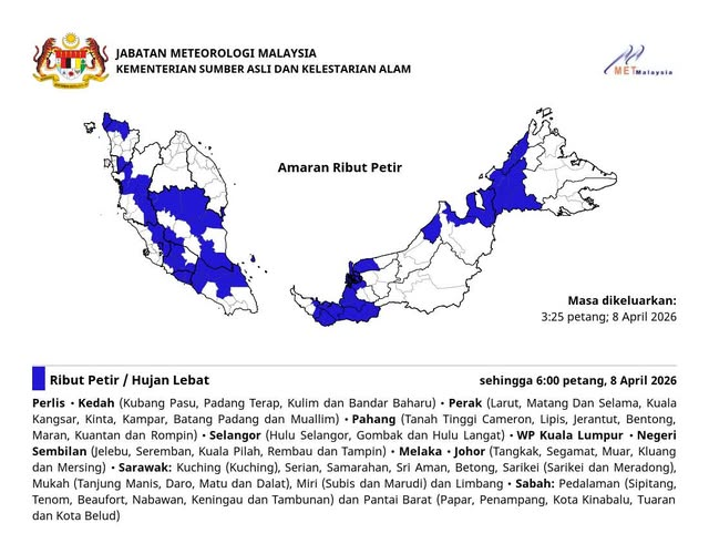 气象局今日下午发布全马多地雷雨警报,提醒民众在傍晚6时前需严加防范强降雨及闪电。根据气象局在下午3时25分更新的预警图,受影响范围横跨半岛多个州属、吉隆坡联邦直辖区以及东马两州,大部分地区的恶劣天气预计将持续整个下午。