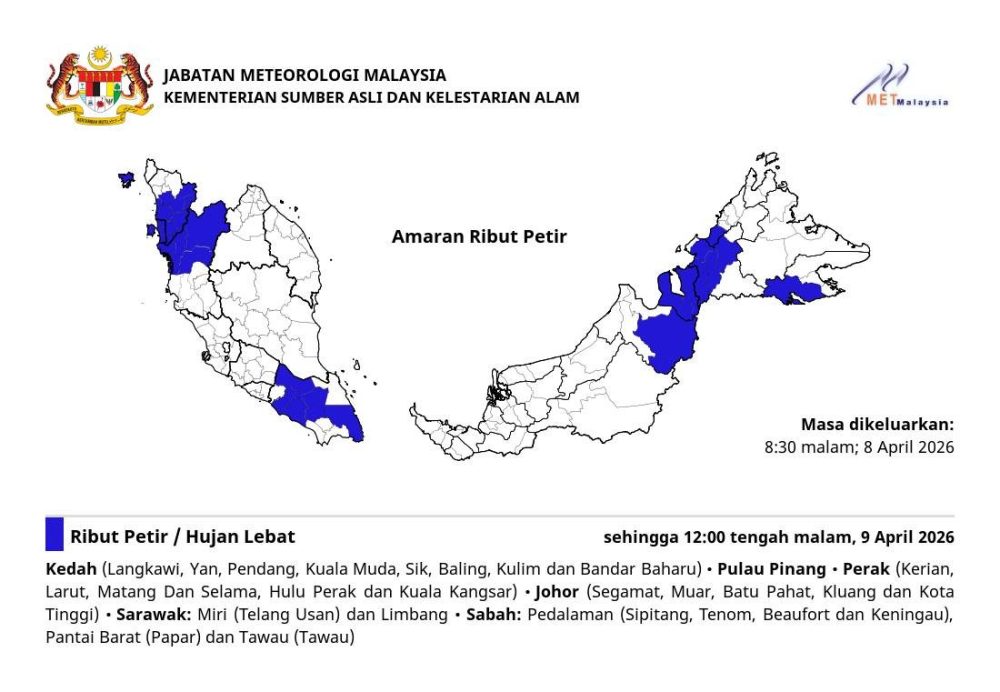 气象局于今晚(2026年4月8日)8时30分发布雷雨警报,预计全国多地将出现雷暴、豪雨及强风天气,警报持续至4月9日(星期四)午夜12时。