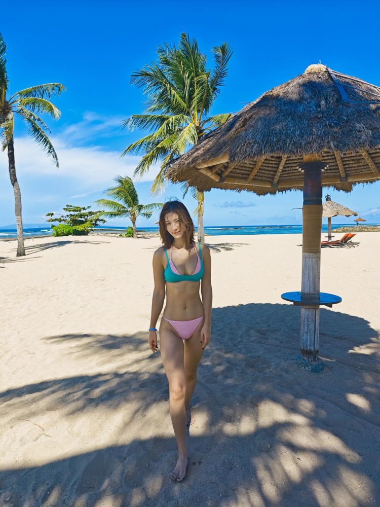画面中,她身穿比基尼置身沙滩,背景是椰林与碧海蓝天,整体氛围轻松惬意,充满度假气息。