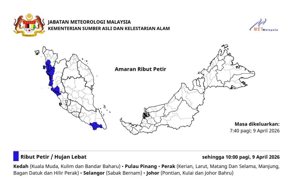 根据气象局今早7时40分发布的通报,受影响地区包括吉打、槟城、霹雳、雪兰莪及柔佛部分地区。其中,吉打涉及瓜拉姆达、居林及万拉峇鲁;霹雳则包括吉辇、拉律马登司南马、曼绒、峇眼拿督及下霹雳。