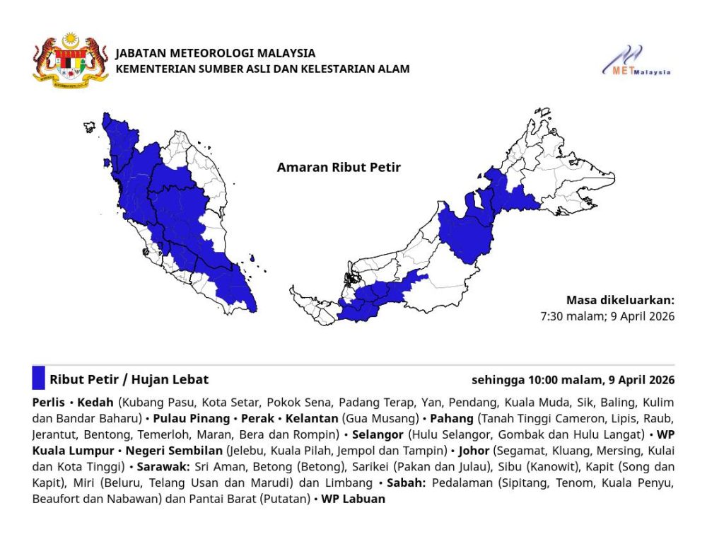 大马气象局今晚发出雷雨与豪雨警报,全国多州多个地区预料受恶劣天气影响,警报从今晚7时30分发出,生效至今晚10时。
