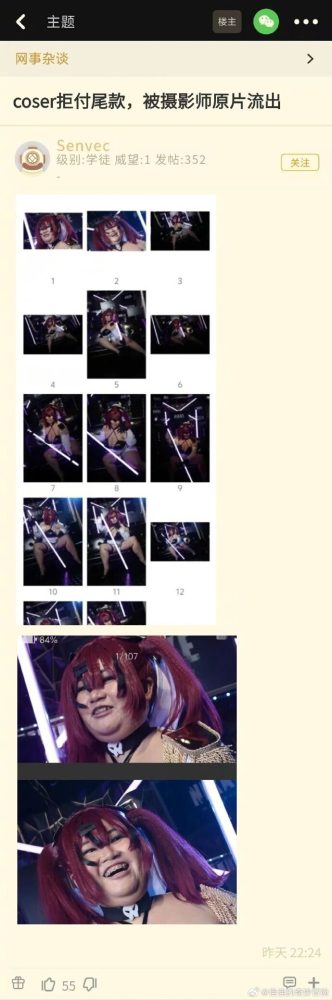 一场疑似因拍摄尾款引发的网络纠纷,近日在中国社交平台持续发酵。网传一名网美Coser在完成拍摄后未支付尾款,摄影师随后把多张未经修图的原始照片公开到论坛,因画面与外界常见的精修成品落差明显,迅速引起大批网民讨论。