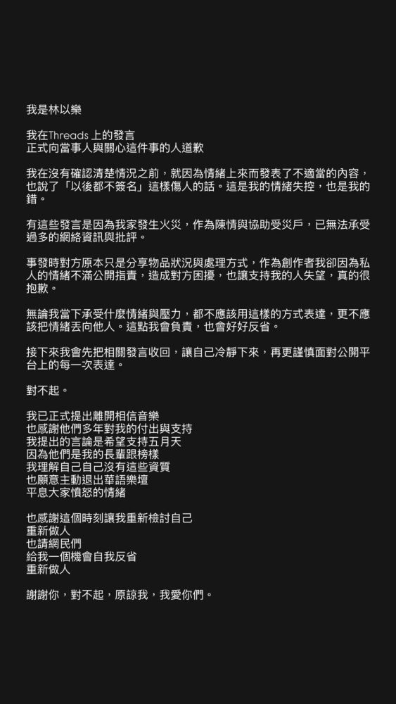 对此,林以乐今日发文解释,称近期因家中发生严重火灾,在协助处理相关事务之际情绪承受压力,导致言辞失当。她承认因私人情绪公开指责他人,已对当事人及支持者造成困扰,深感抱歉。