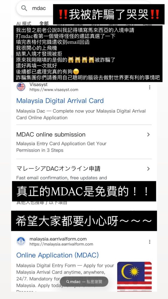 她也借此提醒大众,马来西亚MDAC入境申报本身是免费的,切勿误信第三方收费网站,以免受骗。同时,她也喊话诈骗分子应将聪明才智用在正途,引起不少网民共鸣。