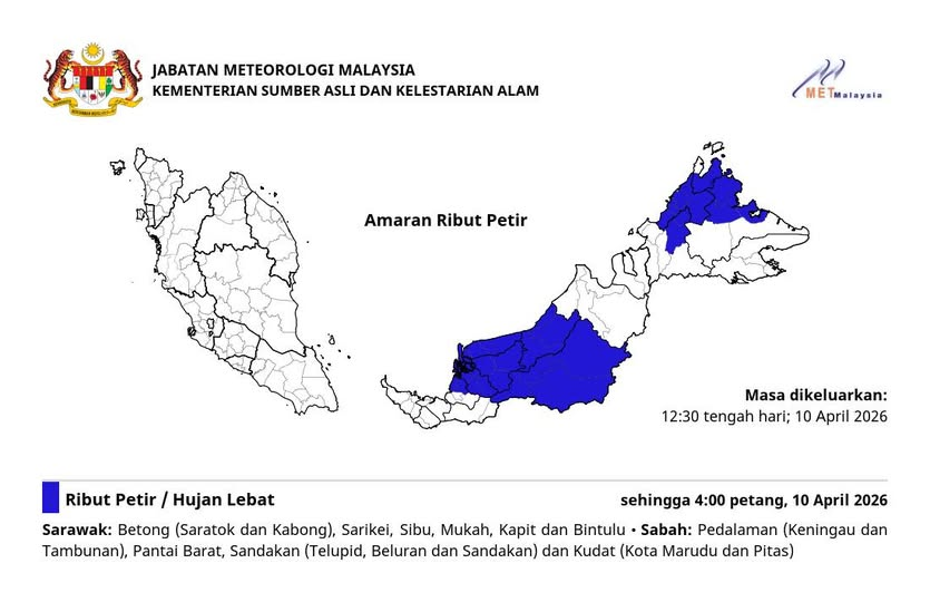 气象局发布最新雷雨警报,砂拉越与沙巴多地预计将出现雷电、强降雨及强风天气,情况将持续至今日(4月10日)下午4时。