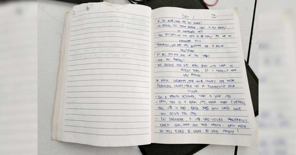 现场同时发现大量笔记本,其中记录着“聊天剧本”,内容包括假扮新加坡人、引导对话以及收入话术等,例如“我来自新加坡,你来自哪个国家?”以及“在新加坡,你的工作收入通常在1500至2000新元”等,用以建立信任并诱导受害者。