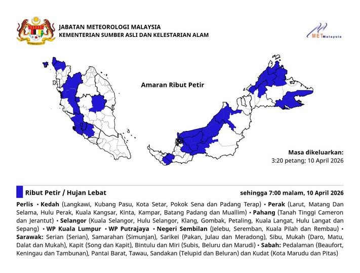 气象局发布雷雨警报,全国多地预计将出现雷电、强降雨及强风天气,情况将持续至今晚7时(2026年4月10日)。