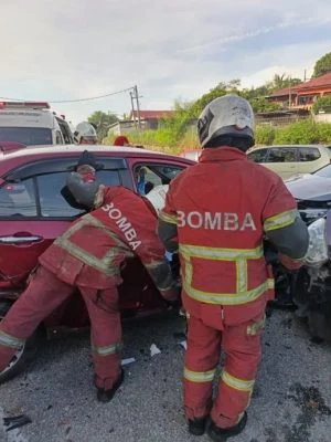 11日早上在双溪毛糯双溪比隆警局前方路段发生一起连环交通事故,涉及多辆车辆碰撞,造成一名女司机受困车内,最终获救后被送院治疗。