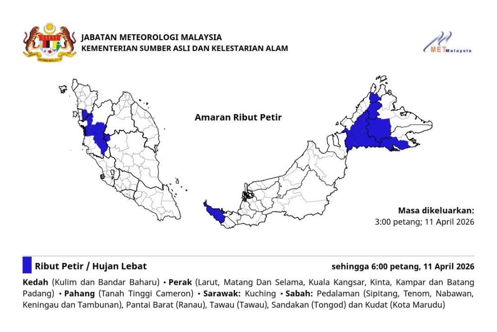 根据最新通报,受影响地区包括吉打州的居林及万拉峇鲁;霹雳州的拉律、马登与司南马、江沙、近打、金宝及巴登巴当;彭亨州的金马仑高原,以及砂拉越古晋。