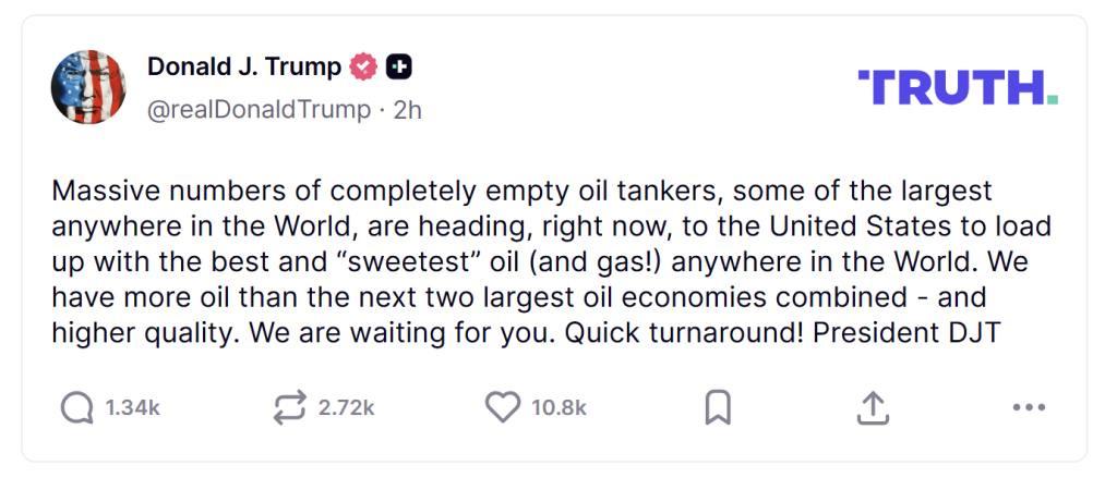 根据路透社报道,特朗普是在Truth Social发布这番言论,并以“我们正等着你们”及“快速周转”等字句,向外界传递美国准备承接更多能源装运需求的信息。整段表态的重点,明显放在凸显美国能源供应能力,以及当前国际市场对美国油气的需求预期。