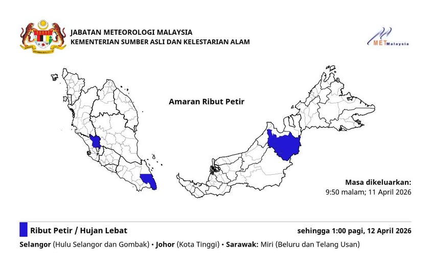 受影响地区包括雪兰莪乌鲁雪兰莪及鹅唛、柔佛哥打丁宜,以及砂拉越美里(Beluru与Telang Usan一带),相关不稳定天气将持续至4月12日凌晨1时。