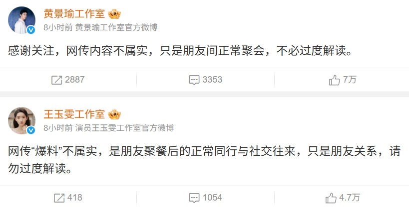 王玉雯方面也同步作出澄清,表示网传爆料存在偏差,当天行程属一般社交活动,希望公众理性看待,避免不必要的误解。