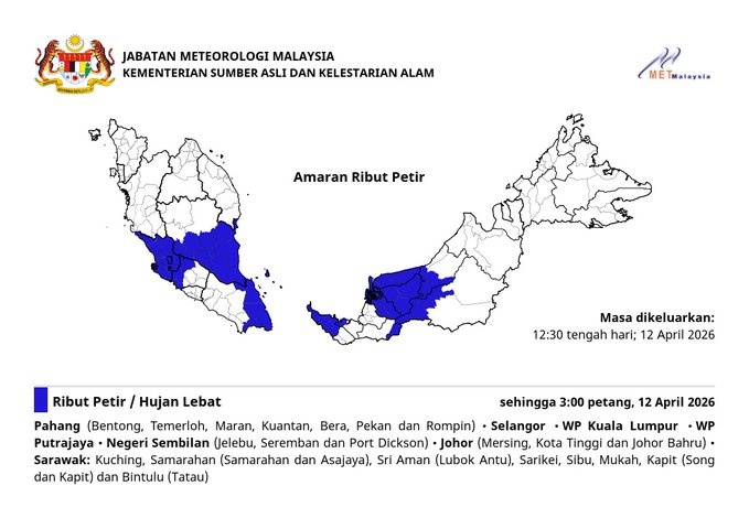 马来西亚气象局发布短时天气预警,预计半岛中部与南部,以及砂拉越多个地区将持续出现雷雨天气,相关警报生效至下午3时。