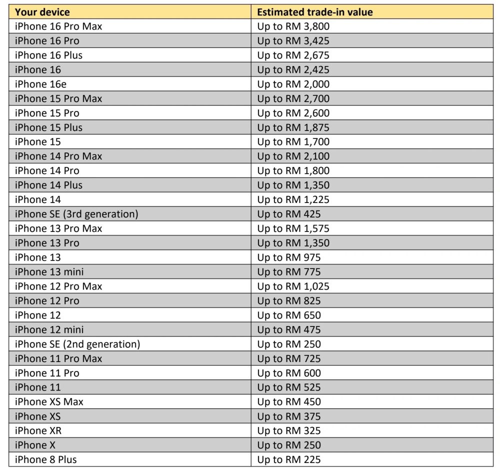 在该计划下,不同型号与状况的iPhone可获得不同回收价,整体范围约介于RM225至RM3800之间,实际金额将依据手机型号及机况评估而定。