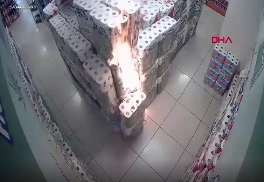 从流传视频可见,纸巾堆在短时间内起火,店员发现现场出现烟雾后,立即通报求助。消防、警方及医护人员随后赶到现场,火势也在短时间内被扑灭,不过部分商品已在事故中受损。