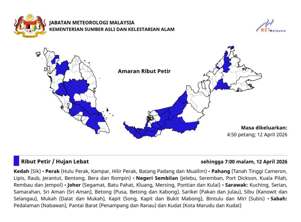 马来西亚气象局今午发布雷雨警报,全国多州多个地区预计出现雷暴及豪雨,预警从下午4时50分生效,持续至今晚7时。