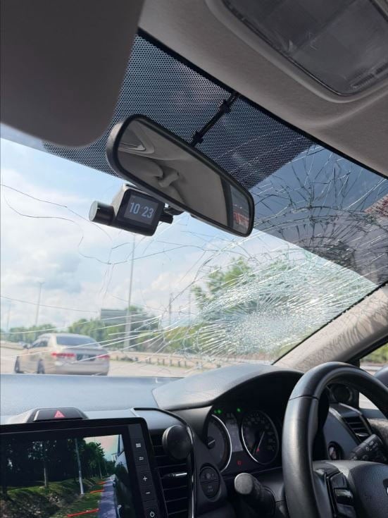 根据网民hda.aqlh在社交平台分享的视频,事故发生在本月11日上午10时11分。当时车辆正在大道上正常行驶,途中突然传出一声巨响,挡风玻璃随即出现大面积裂纹,画面可见玻璃表层迅速布满如蜘蛛网般的破裂痕迹。