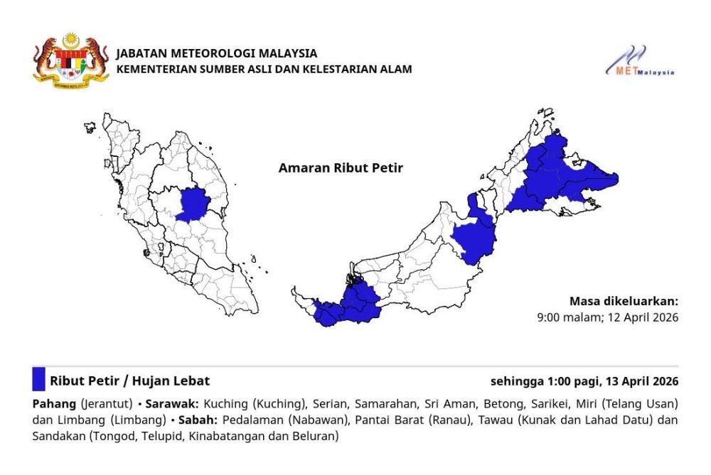 气象局于4月12日晚上9时发出最新短期天气警报,指出国内多地将迎来雷雨、强降雨及强风天气,相关情况预计持续至4月13日凌晨1时。