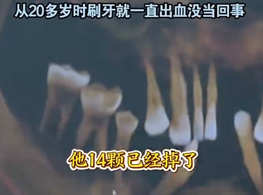 据《潇湘晨报》报道,该男子自20多岁起刷牙时便经常出现牙龈出血,但一直未及时就医,错过了牙龈炎的最佳治疗时期。医生指出,牙周病早期常见牙龈出血、口臭等症状,但不少患者误以为只是“上火”,实际上已是细菌侵蚀牙槽骨的警示信号。