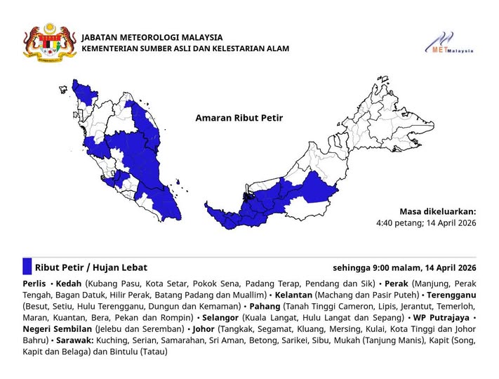 气象部门于今日(2026年4月14日)下午4时40分发布雷暴警告,预计从傍晚至晚间9时,马来西亚多地将出现雷暴、强降雨及大风天气。